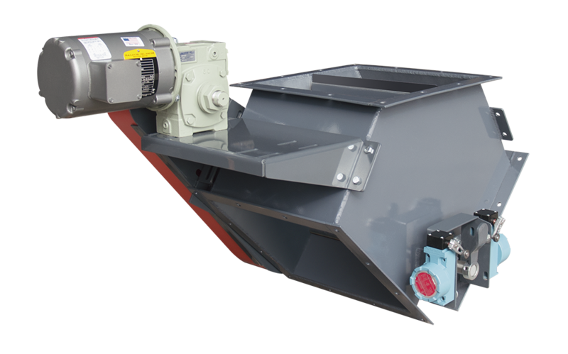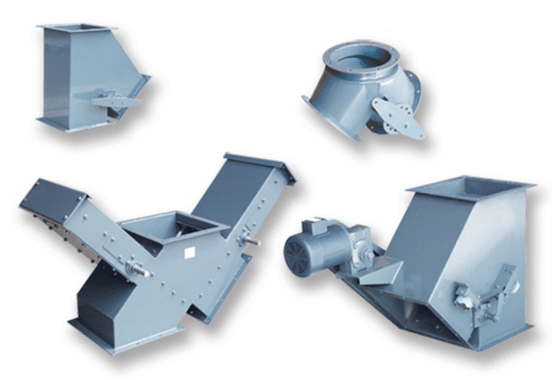 Bucket valves, also known as basket valves or pan valves, are by far the most common type of valve used. This type of valve consists of a formed channel shaped diverter with an inlet shroud that feeds the material flow into the inside of the formed bucket. This inlet shroud does somewhat reduce the square inch area at the inlet but it is rare that anyone will select a larger valve size over the spouting size to compensate for this loss. Bucket valves provide excellent feel for a person operating that unit with cables from a remote source because of the over center toggle spring and the positive metal to metal stop. A bucket valve is subject to some leakage between the bucket and the housing when one of the discharge spouts get plugged or when there is enough positive air pressure coming back up a discharge spout. Caution must be used on a manually operated bucket type "K" valve that will be operated in the vertical position. If material does not enter the valve in a straight down flow it can cause the bucket to open slightly, allowing some leakage. This same problem can occur if the material falls vertically for quite a distance which will result in a heavy impact against the bucket.